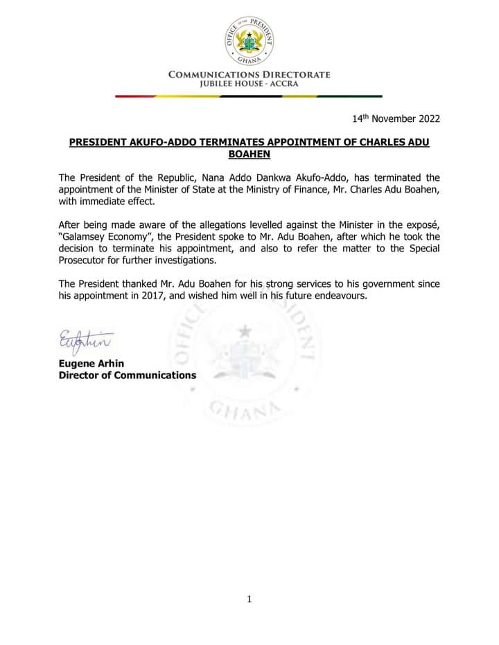 “The President spoke to Mr. Adu Boahen, after which he took the decision to terminate his appointment, and also to refer the matter to the Special Prosecutor for further investigations.”