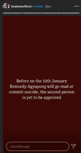 He wrote on his wall “Before on the 10th January Kennedy Agyapong will go mad or commit suicide, the second person is yet to be approved”.