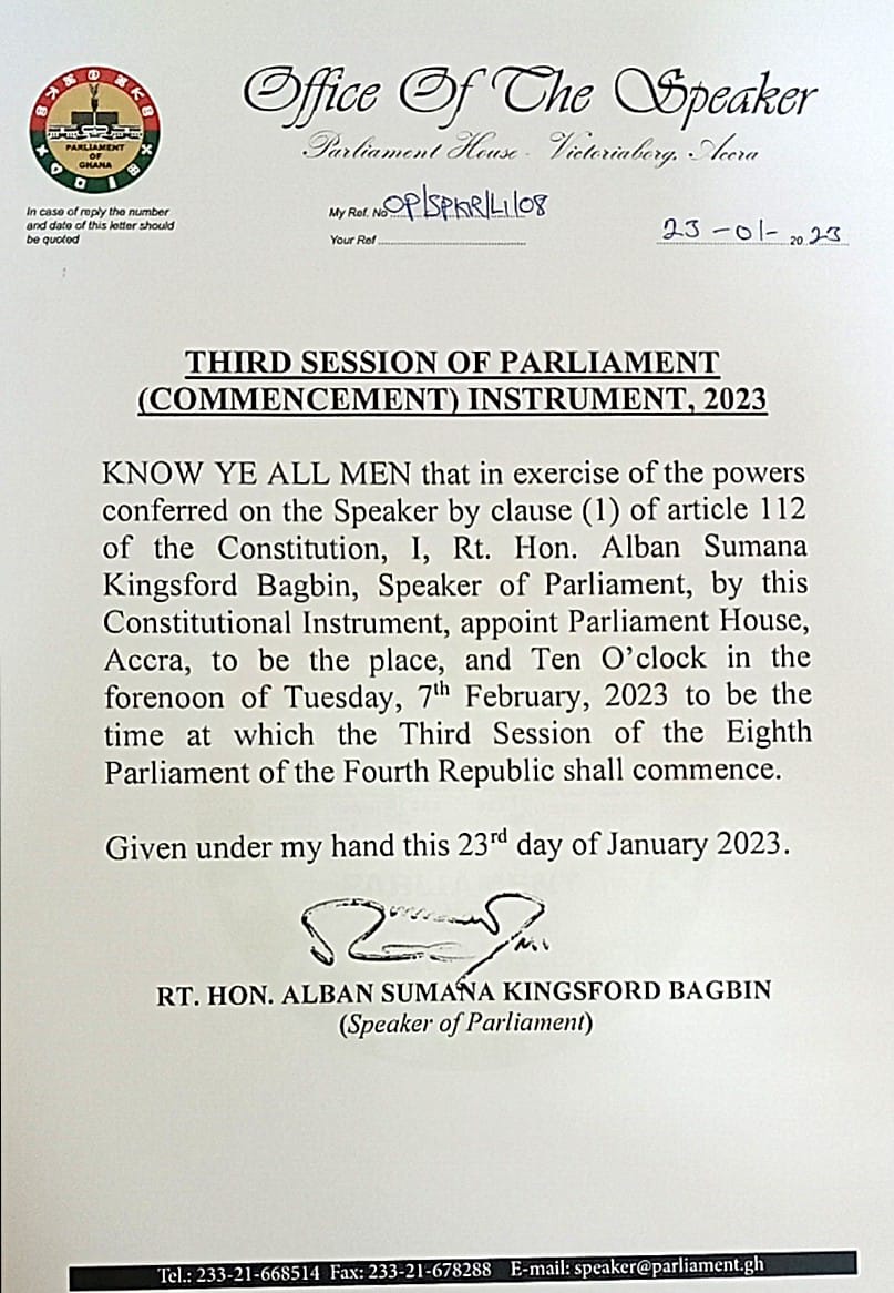 Announcing the resumption date, the Speaker of Parliament, Alban Bagbin, in a statement said: “KNOW YE ALL MEN that in the exercise of the powers conferred on the Speaker by clause (1) of article 112 of the Constitution, I, Rt. Hon. Alban Sumana Kingsford Bagbin, Speaker of Parliament, by this Constitutional Instrument, appoint Parliament House, Accra, to be the place, and Ten O’clock in the forenoon of Tuesday, 7th February 2023 to be the time at which the Third Session of the Eighth Parliament of the Fourth Republic shall commence.”