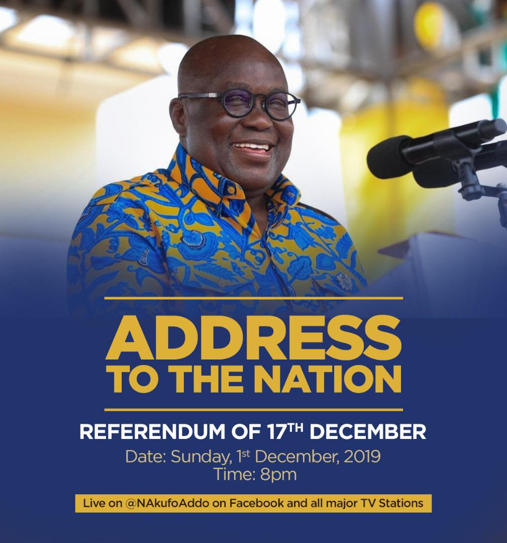 President Nana Addo Dankwa Akufo-Addo will later tonight, break his silence on the upcoming December 17 Referendum.