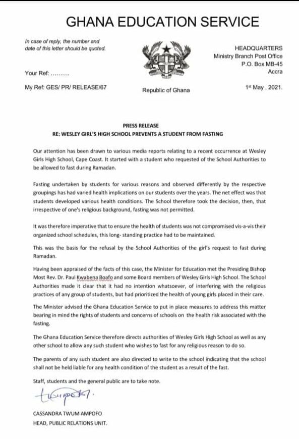 The Ghana Education Service (GES) has directed the management of Wesley Girls’ High School to allow Muslim students at the school to observe the ongoing Ramadan fast.