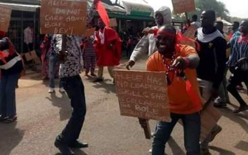 Clad in red attire, armbands and headgear, the aggrieved executives and party supporters on Tuesday, 8 January 2019 carried placards, some of which read: “Must Go 4 Election 2020”, “Alele is a threat to NPP’s progress”, and “Alele is not a developer”.